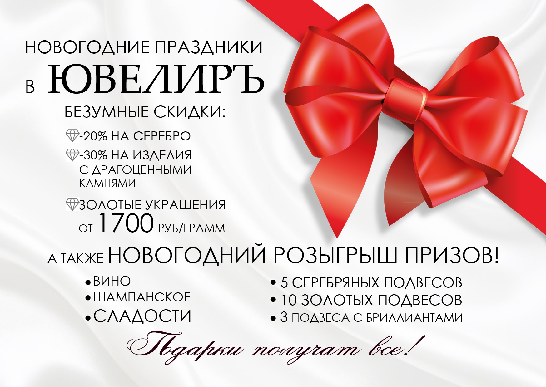 Поздравляем Вас сердечно с наступающими Новогодними праздниками и объявляем о начале Новогодних скидок и Новогодней лотереи в ЮВЕЛИРЪ, а именно: