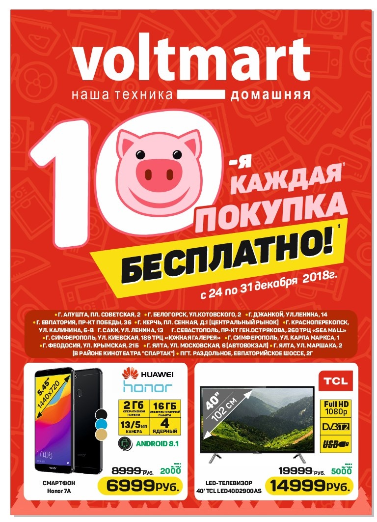 * Под акцией «Каждая десятая покупка бесплатно» следует понимать возможность приобретения товара, по льготной цене, каждой десятой покупки в сети магазинов «Вольтмарт».
