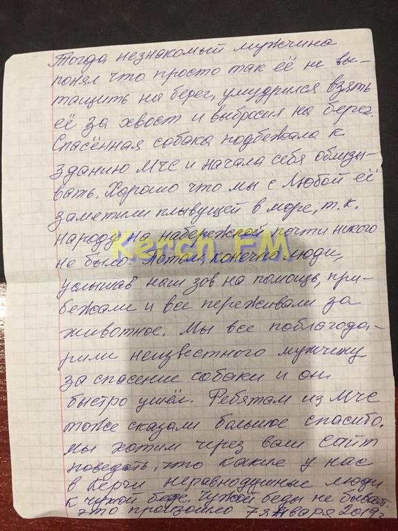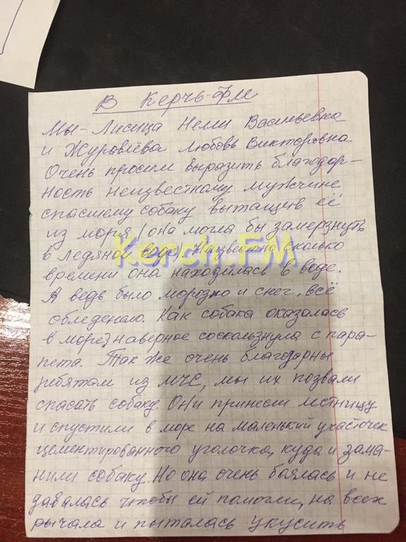 Во время рождественских морозов в Керчи собака с парапета на набережной упала в море. Животное долго плавало в поисках отмели. Пожилые керчанки пытались сами помочь собаке, но безрезультатно. О спасении животного они рассказали редакции Керчь.ФМ и просили через наш сайт поблагодарить неизвестного мужчину, который в итоге вытащил животное на берег из ледяного моря.