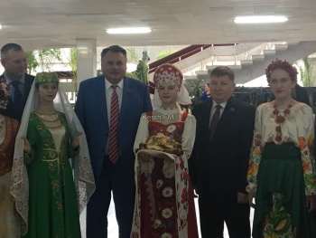 Делегацию встречали с хлебом с солью девушки в десяти национальных костюмах.