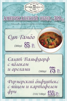 Американский обед: пряный наваристый суп Гамбо, салат Вальфдорф с хрустящим салатом, сочным зелёным яблоком и крошкой арахиса, сочный Фермерский бифштекс с глазуньей и картофелем фри - 320 р.