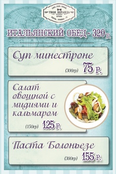 Итальянский обед: суп минестроне, салат овощной с мидиями и кальмаром, паста Болоньезе - 320 р.