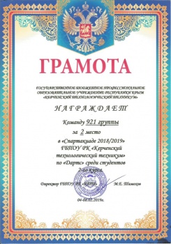 Второе место команда группа № 921 (профессия - Слесарь по ремонту строительных машин. Мастер производственного обучения - Колоскова Н.Г.) - 337 очков.