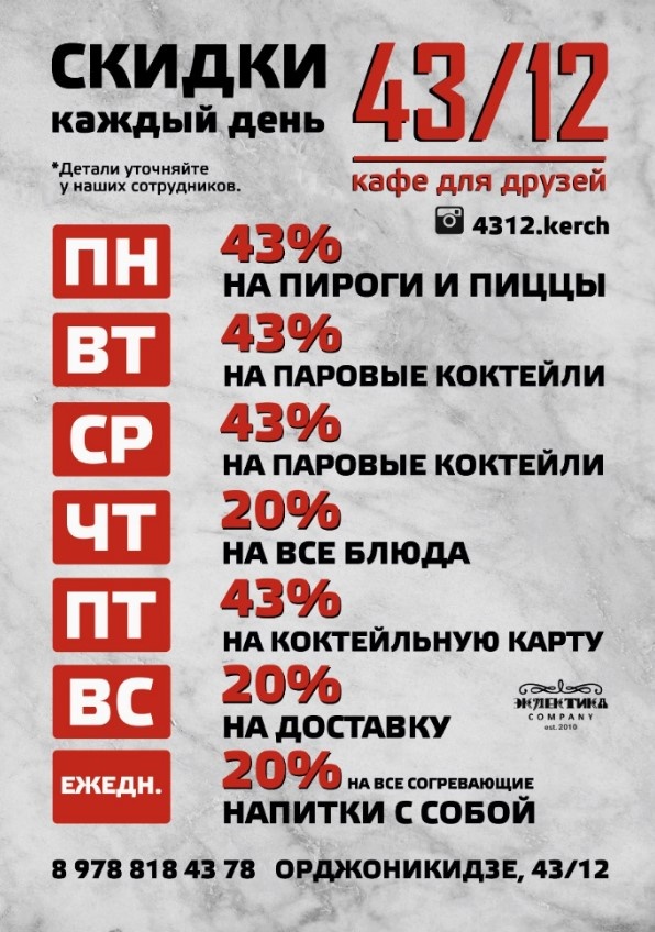 Ежедневные скидки и акции для гостей кафе 43/12.