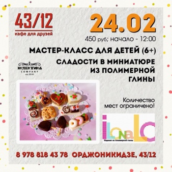 В воскресенье, 24-го февраля, для юных гостей кафе запланирован увлекательный мастер-класс от Илоны Ло. Ребята слепят миниатюрные сладости из полимерной глины.