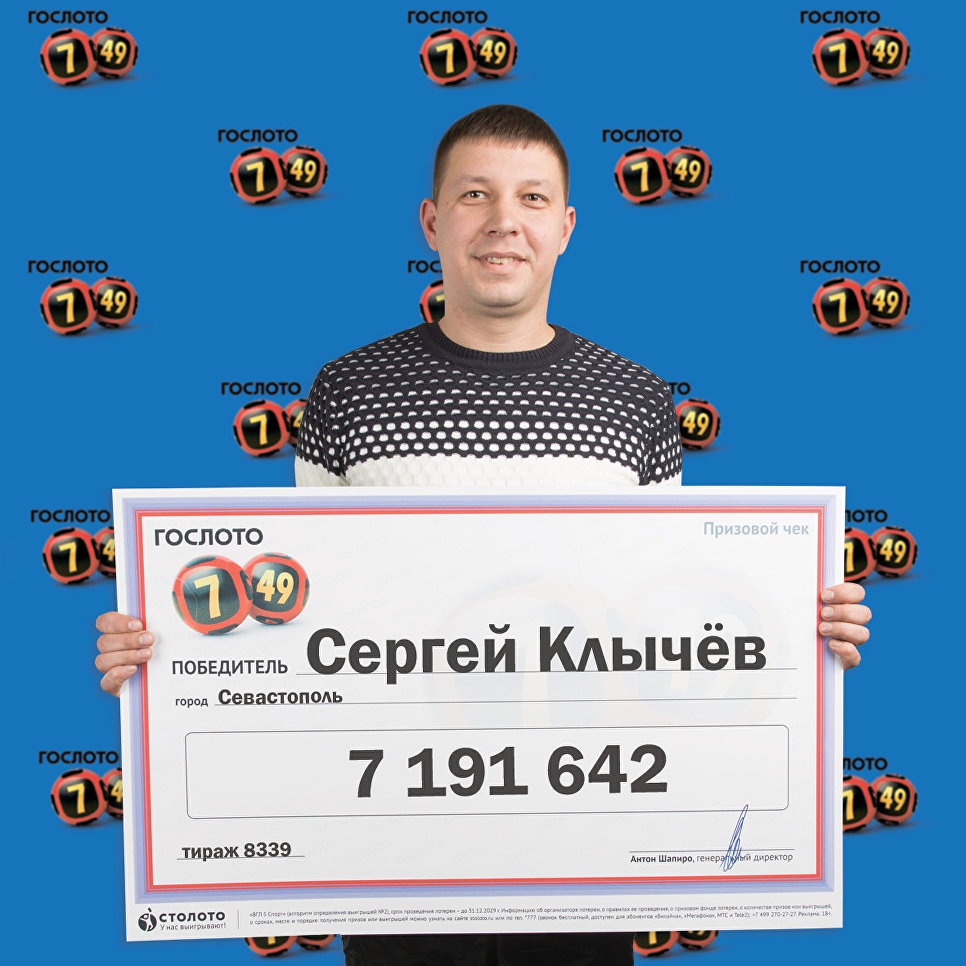 Севастополец Сергей Клычев, слесарь-судоремонтник военных кораблей, уже был обладателем большого выигрыша - тогда тираж принес ему 118 000 рублей. Однако, участие в 8339-м тираже лотереи "Столото" "7 из 49" обернулось для него настоящей удачей: из семи чисел Сергей угадал шесть и выиграл 7 191 642 рубля.