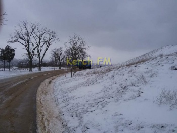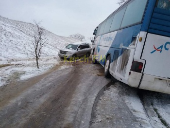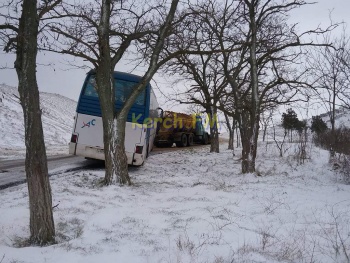 Как стало известно журналисту, в Керчь из Краснодарского края приехали туристы. Их небольшой автобус не смог проехать, так как дорогу перекрыл другой туристический автобус также из Краснодарского края. Что произошло - пока точно не известно, Предположительно, обочину занесло, и автобус пошел юзом за пределы дороги.