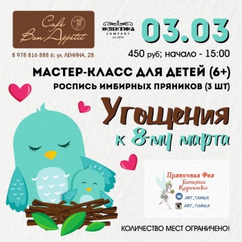 3-го марта под руководством пряничной феи, Татьяны Карпенко, состоится творческое занятие по росписи имбирных пряников. 3 красочных и вкусных угощения ребята задекорируют к празднику - 8-ое марта. Возрастная категория - 6+. Участие - 450 руб. Начало - 15:00. Количество мест ограничено!