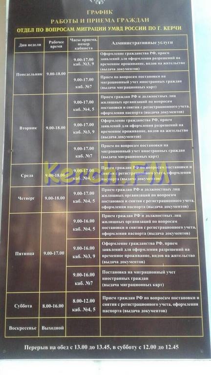 Керчане не могут узнать актуальную информацию относительно работы паспортного стола Керчи . На сайте полиции опубликован только график приема руководителей. Так, начальник отдела по вопросам миграции УМВД России по г. Керчи Сергей Михайлович Брагэ принимает каждые первый, второй и третий вторник месяца с 15 до 17 по адресу Керчь, ул. Комарова, 7 каб. 10. Его заместитель Ирина Николаевна Левченко принимает каждые первый, второй и третий четверг месяца в кабинете № 4.