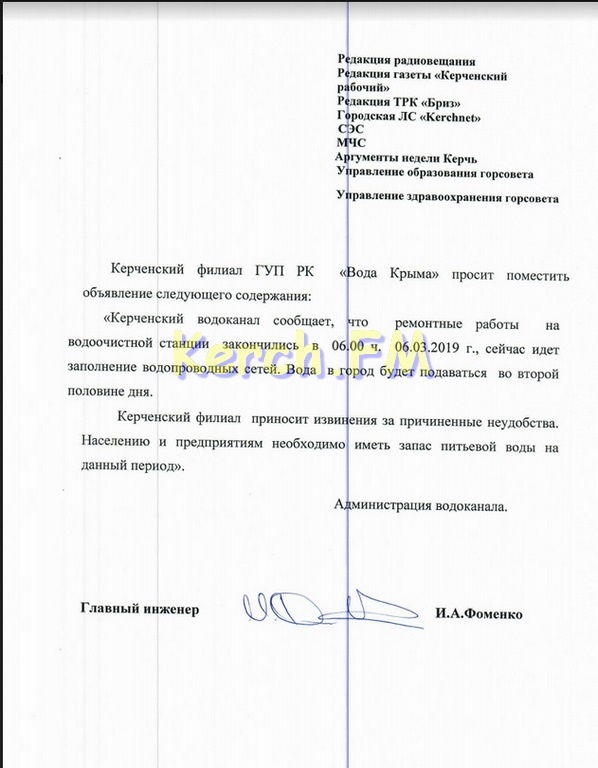 Керченский водоканал проинформировал керчан, что ремонтные работы на водоочистной станции закончились в 6:00 6 марта и сейчас идет заполнение водопроводных сетей, - предает Керчь.ФМ.
