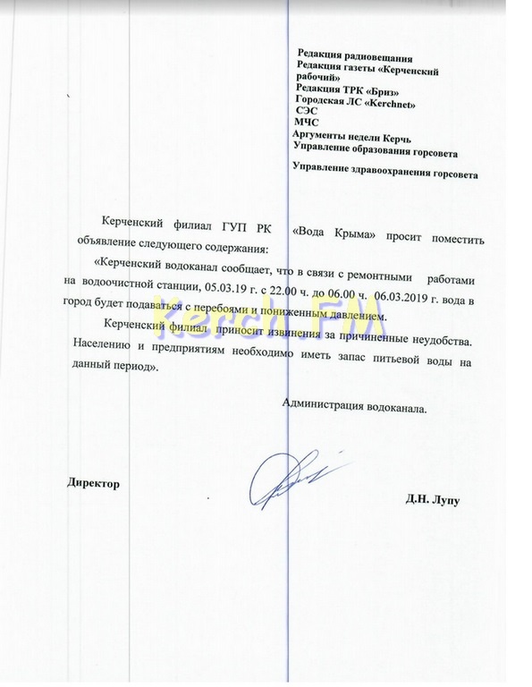 Сегодня с утра все жители Керчи, в квартиры и дома которых водоснабжение подается централизовано, оказались без воды. Водоканал сообщил о работах на водоочистной станции. Однако, работы, согласно сообщению, должны были быть закончены в 6:00 6 марта, а воды нет до сих пор, - передает Керчь.ФМ.