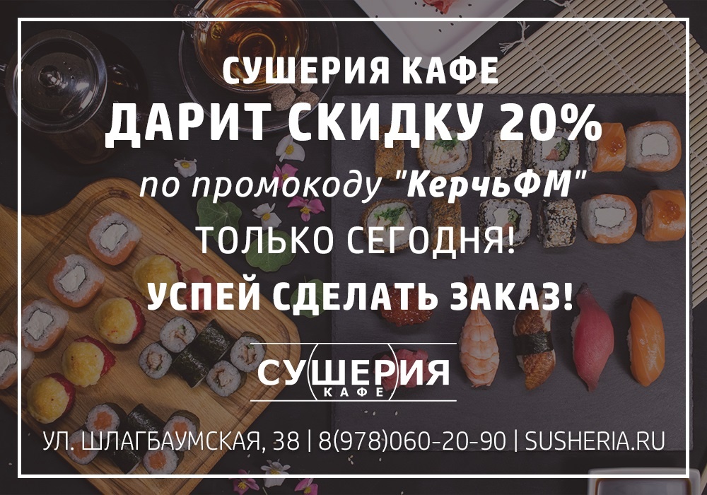 Друзья, специально для читателей сайта КерчьФМ, Сушерия Кафе дарит скидку 20% на заказ только сегодня!
