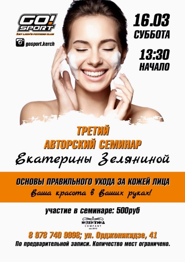В субботу, 16 марта, в фитнес-клубе Go!Sport (ул. Орджоникидзе, 41) состоится 3 авторский семинар от Екатерины Зеляниной на тему: «Основы правильного ухода за кожей лица».