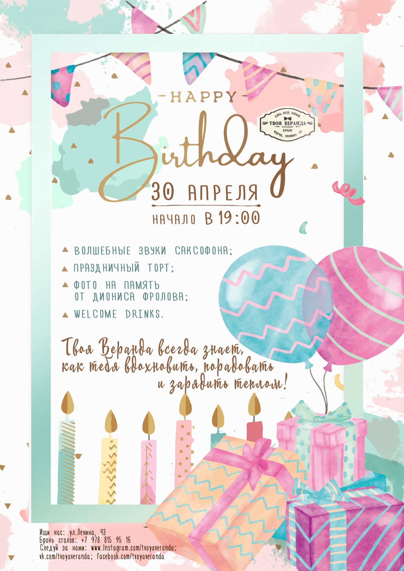 Начало в 19:00! Бронь по телефону: +7 978 815 95 16.