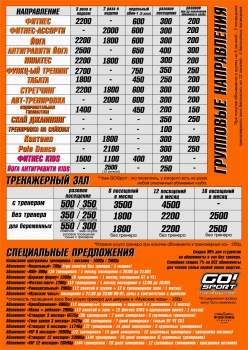 Режим работы фитнес-клуба Go!Sport: ПН-ПТ с 9:00 до 23:00; СБ с 9:00 до 15:00; ВС - выходной.