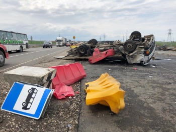 По неизвестной причине произошло столкновение грузовика и автомобиля «Lexus», от удара грузовой автомобиль опрокинулся и получил серьезные повреждения. Данных о пострадавших нет.