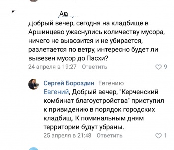 «Добрый день. Обращаюсь к вам с просьбой опубликовать статью о том, как нынешние власти города-героя Керчи только показушно проявляют уважение к ветеранам ВОВ! В далеком 1941-м моя бабушка Мирошниченко Нина Арсентьевна окончила школу, а на следующий день наступила война. Так вот, она, будучи вчера ещё школьницей, не осталась в тылу, а пошла на фронт, где была делопроизводителем в звании ефрейтора. Она прошла всю войну, там же на фронте она познакомилась с нашим дедушкой Цымборевич Тихоном Игнатовичем, который был старшим техником в звании лейтенант. Дедушка перенёс множество ранений, контузия, но он вместе с бабушкой отпраздновали День Победы-и этот праздник стал для них навсегда самым главным в их жизни. Множеством орденов и медалей их награждали за участие в ВОВ. Но времена изменились, и нынешние власти наплевательски относятся к их подвигу! Приехав перед Пасхой на кладбище, мы не смогли покрасить оградку, к ней не подступиться-огромная груда мусора, веток, бетонных блоков...Администрация кладбища только разводят руками, мол ответственность на УЖКХ. Почитав на керченских форумах об аналогичной проблеме, ужаснулась-одни отписки, где Бороздин отвечает- то заказчик недобросовестный, то все до конца апреля уберем...А по итогу-воз и ныне там. Зато на городских мероприятиях, приуроченных к празднованию Дня Победы, так хорошо говорить о подвигах и уважении к ветеранам.-А где действия, власти?! Ветераны в отличие от вас не ныли, а в голод и холод совершали подвиги, а вы только рот открывать и можете!», - написала керчанка