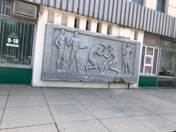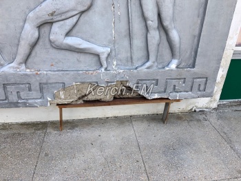 В Керчи, на здании Дворца спорта «Судостроитель», треснул и частично обвалился барельеф, - передает Керчь.ФМ. Барельеф с изображением спортсменов  подперли деревянной лавочкой.