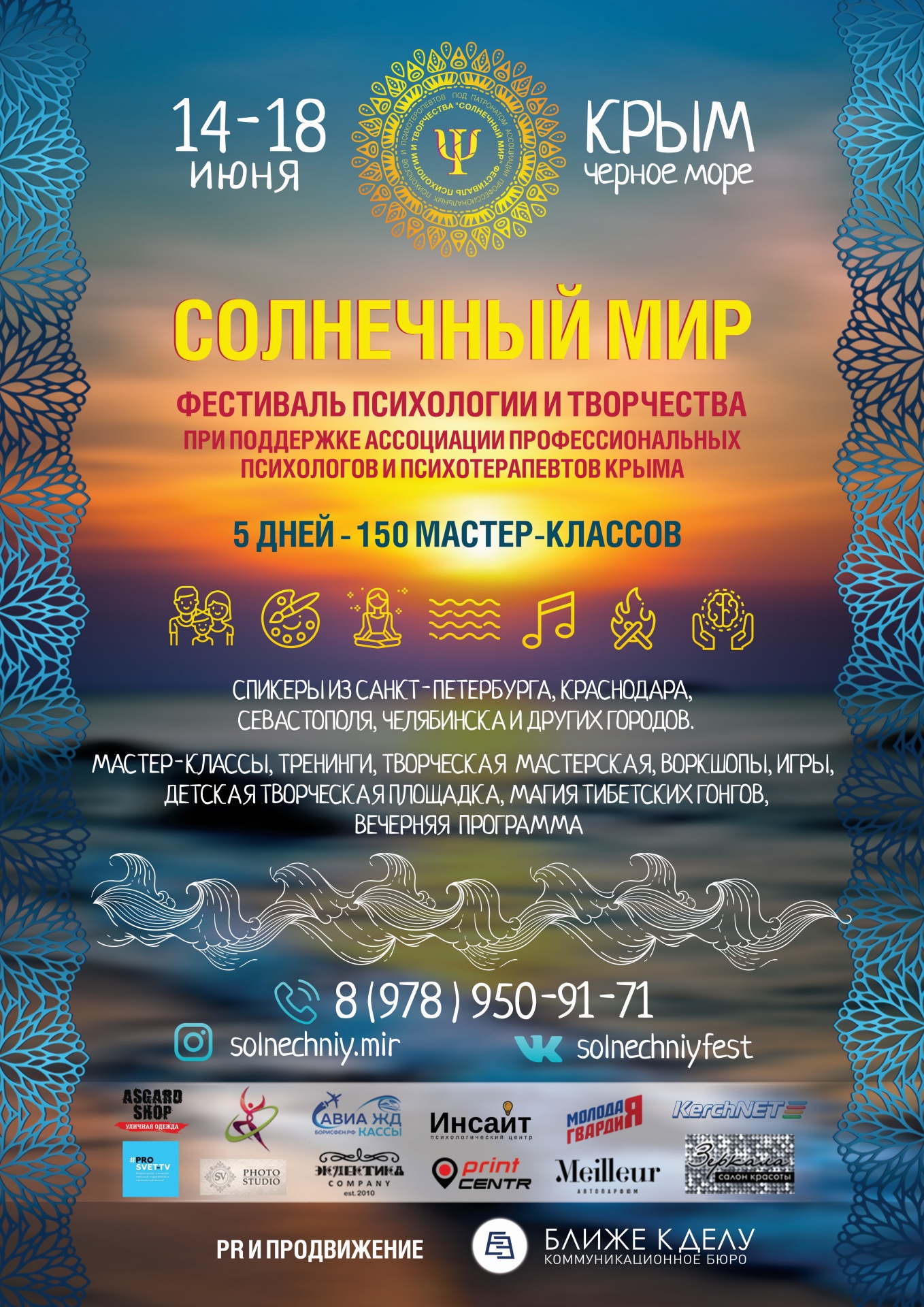 Уже совсем скоро, масштабный фестиваль психологии и творчества "Солнечный мир" с 14 по 18 июня 2019! Место проведения - База отдыха «Залив» (п. Героевка).