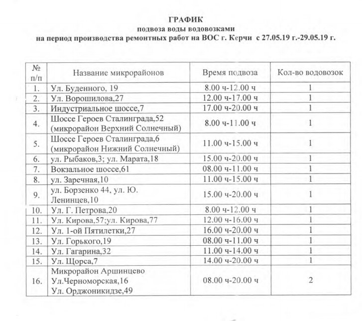 Керченский филиал приносит извинения за причиненные неудобства. Населению и предприятиям необходимо иметь запас питьевой воды на данный период.