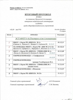 В абсолютной эстафете 4х50 метров вольным стилем смешанная, победила команда МБОУ г. Керчи РК «ШКОЛА № 2» (директор - Татьяна Сидоренко), которая выступила в следующем составе : Александр Снигирев, Дмитрий Сошенко, Илья Терещук, Виктория Дронова, на втором месте дружный коллектив МБОУ г. Керчи РК «ШКОЛА - ГИМНАЗИЯ № 2» (директор - Татьяна Бойко), третьими стала команда «ШКОЛА № 1».
