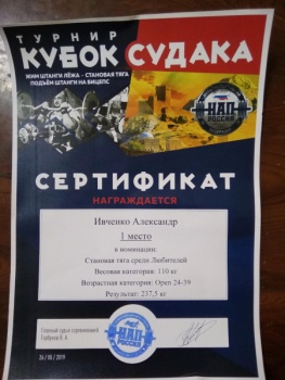 По результатам соревнований следователь отдела полиции №1 УМВД России по г. Керчи старший лейтенант юстиции Александр Ивченко, выступая в весовой категорий 110 килограмм, занял 1 место. На состоявшемся турнире Александр выполнил норматив кандидата мастера спорта России.