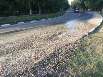 Вся дорога превратилась в склизкое месиво. Машины заносит, а мотоциклист чуть не вылетел с проезжей части, при этом у него была небольшая скорость.