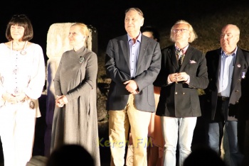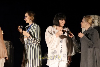 Три музы Арина Новосельская, Елена Аксенова, Светлана Учайкина, и Василий Лановой совершили обряд посвящения вином, объединив в едином сосуде три вида крымского вина и напоив им землю Пританея и гостей.