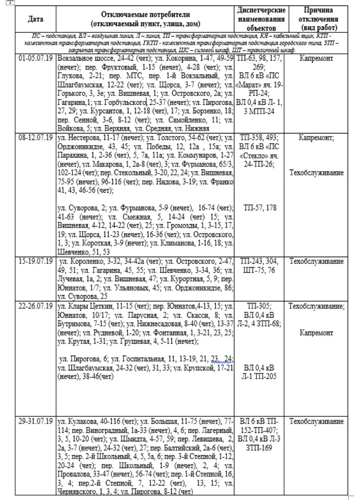 ГУП РК «Крымэнерго» сообщает о том, что в связи с плановым ремонтом электрооборудования в июле в период с 8 до 17 часов будут происходить отключения линий электропередачи согласно нижеприведенному графику, - передаёт Керчь.ФМ