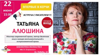 В Керчи 22 июня в 15:00, в библиотеке -филиале №3 им. Н. Островского,  состоится встреча с популярным писателем, автором нескольких десятков книг в жанре сентиментальной и остросюжетной прозы - Татьяной Алюшиной.