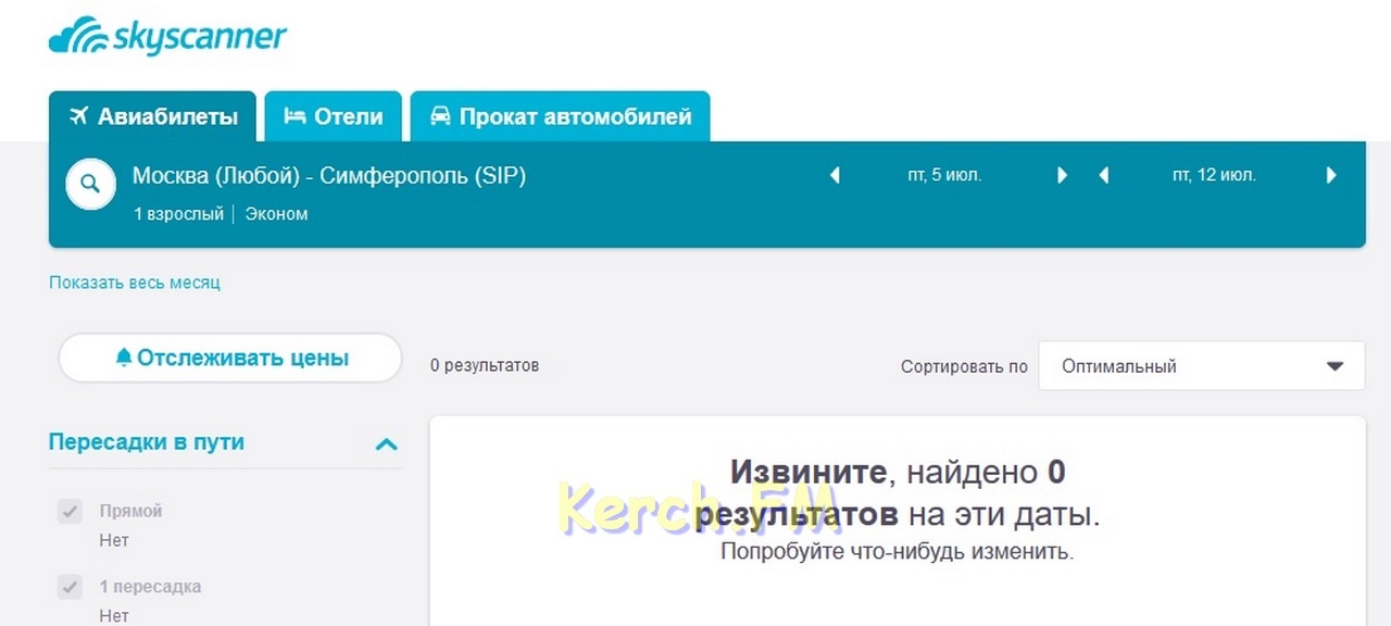 Британский сервис поиска авиабилетов Skyscanner перестал продавать билеты в Симферополь. Начиная с пятницы сервис в крымском направлении показывает нулевой результат поиска, - передает Керчь.ФМ.