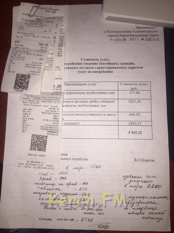 Единственный чек, который не выдали, это за услугу одевания тела умершего в морге - там керчане заплатили «по тарифу» 2200 рублей.
