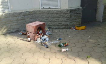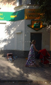 Так, как магазин несколько дней не работает, и уборщика нет, в урне накопилось достаточно мусора, который отдыхающие задушевно пинали ногами по тому, что осталось от тротуара прилегающего к магазину.