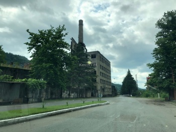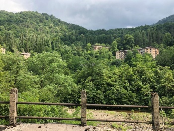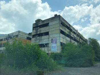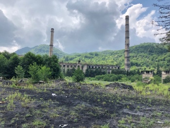 Отправились через Ткварчел на Акармару. Несмотря на то, что город заброшенный, туда до сих пор ходит автобус. Легковушка туда проедет спокойно по сухой дороге. Вдоль дороги в Ткварчеле течет река, через которую висят подвесные мосты - очень красивые и, кажется, опасные. Проезжая Ткварчел по жилам прокатился страх - огромный завод по производству угля стоит заброшенным, некоторые здания поросли кустами, где-то выросли деревья, а где-то даже горит свет. В городе есть многоэтажные дома, автостанция, светофоры.