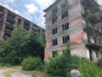 Мы решили зайти в одну из многоэтажек: на дверях табличка с фамилией. Внутри осталась мебель, плита, унитаз и раковина, где-то даже стоит кровать, лежат вещи, детские книги. Дома потихоньку начинают рушиться, кстати в них начали срезать перила. И много-где разбирают кладку из кирпича.
