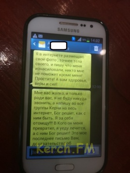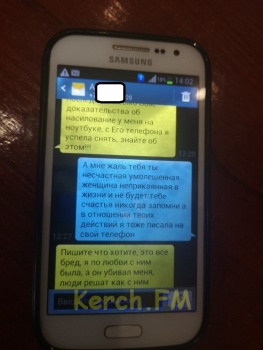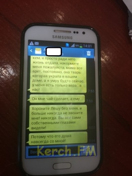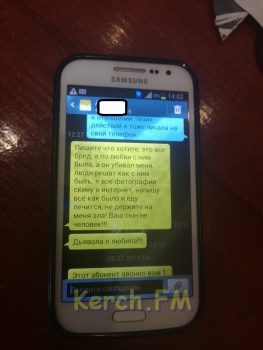 Через 2 часа на мой телефон стали приходить от нее смс о том, что она безумно любит моего сына и просит не разлучать ее с ним, при этом говорила, что своя мать доведет ее до психушки. Потом в пылу неизвестно чего написала, что я буду хоронить своего сына. Потом еще были смс о том, что она выкладывает фото своего тела в интернет и будет писать, что ее изнасиловали», - рассказала керчанка.