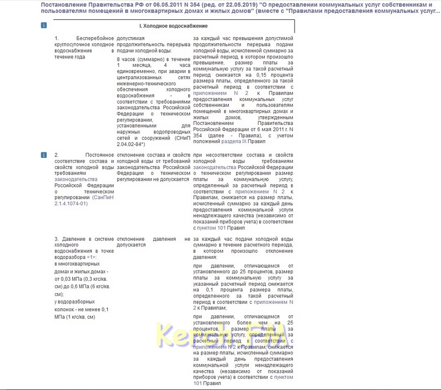 В соответствии с вышеназванным Постановлением Правительства России № 307 отклонения от нормативов давления ХВС исключены - любое отклонение является основанием для уменьшения размера платы за коммунальные услуги. Также является основанием и суммарное отсутствие более 8 часов в месяц холодной воды. Ответственность за выполнение данного Постановления возложена на местные органы власти, власти субъектов Федерации, а также федеральные органы власти.