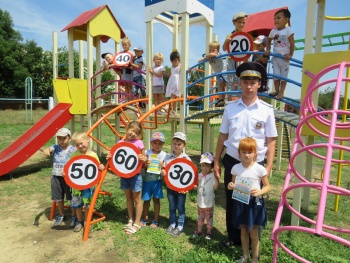 Воспитанники детского сада «Колобок» вместе с дорожными полицейскими вышли на пешеходный переход около образовательного учреждения с большой яркой надписью в благодарность водителям, которые снижают скорость перед проездом пешеходных переходов и пропускают ребят, которые переходят дорогу.