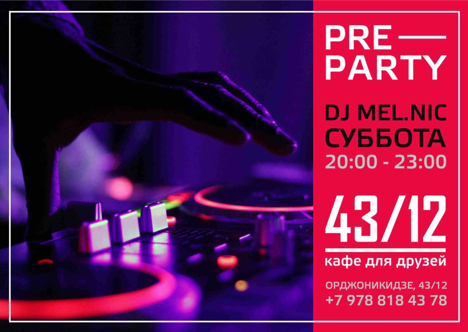 В эту субботу, 20.07, с 20:00 до 23:00 для гостей кафе 43/12 будет играть приглашенный ди-джей. Хорошая музыка, качественные паровые коктейли и, конечно, крымская авторская кухня сделают Ваш вечер незабываемым! Успейте забронировать столик на террасе кафе.