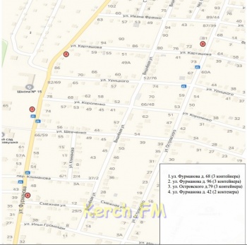 Начальник отдела благоустройства управления жилищно-коммунального хозяйства администрации города Керчи Александр Пахолков сообщил, что в Керчи определены 38 адресов контейнерных площадок, где, по его словам, осуществляется сбор негабаритов: Глухова 10 и 13; Бардина, 7; Московская, 3; Фурманова, 42, 68 и 96; Островского, 79; Комарова, 3, 11, 27, 76, 83 О, 95; Чкалова 92, 106, 131; Дзержинского, 27; Пушкина, 27/9; Чернышевского 19/11; Желябова, 2.