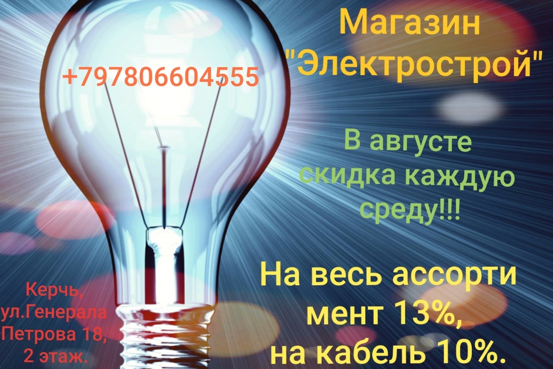 Каждую среду скидки на всю продукцию 13%, а на кабель 10%.