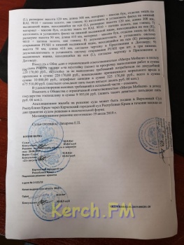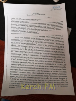 15 июля Керченский городской суд вынес решение, которым обязал ООО «Митра Мобили» установить кухню в соответствии с договором и выплатить керчанину неустойку за просрочку выполнения работ в сумме более 220 тысяч, неустойку за невыполнение досудебной претензии более 220 тысяч, компенсацию морального вреда 10 тысяч, штрафные санкции по договору в размере более 225 тысяч, а всего более 675 тысяч рублей.