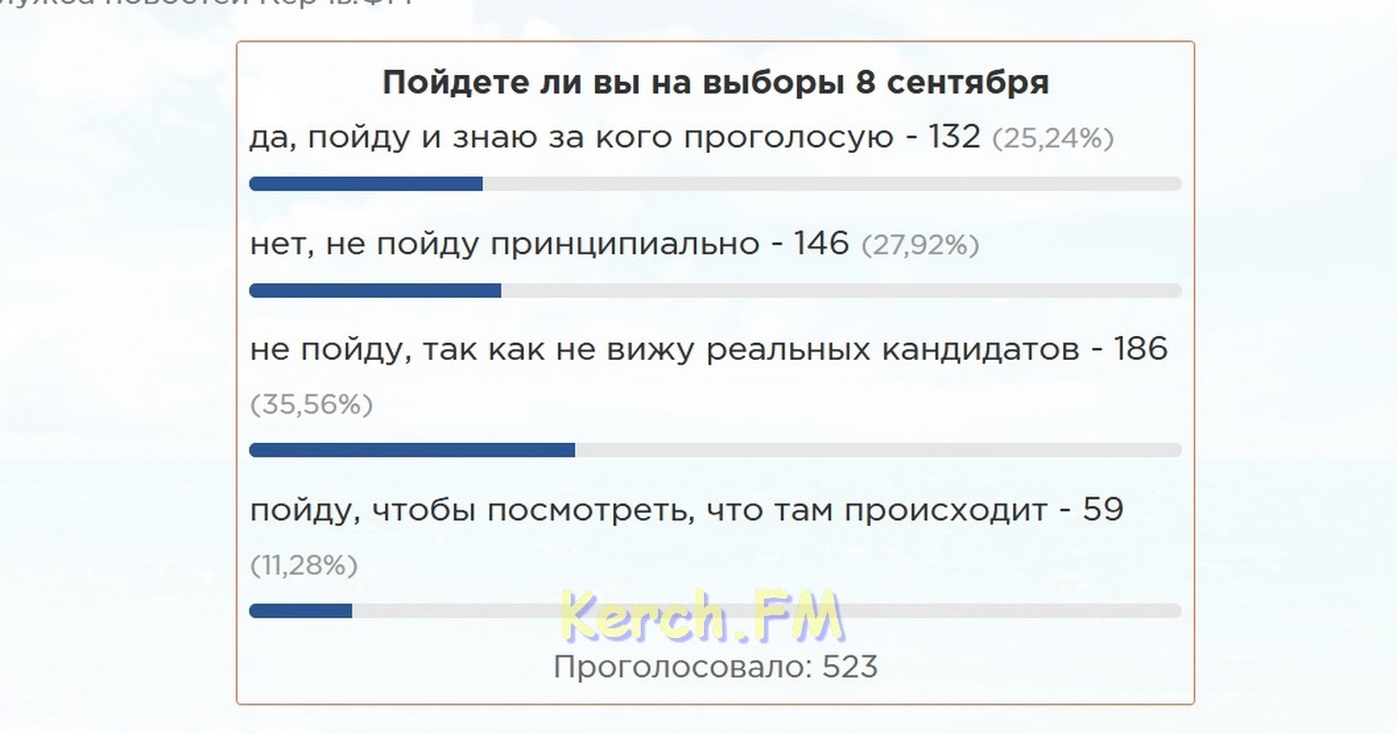 На предстоящие выборы в это воскресенье пойдут чуть более трети читателей сайта Керчь.ФМ Такие результаты были получены в ходе опроса на сайте, проведенного 2-4 сентября.