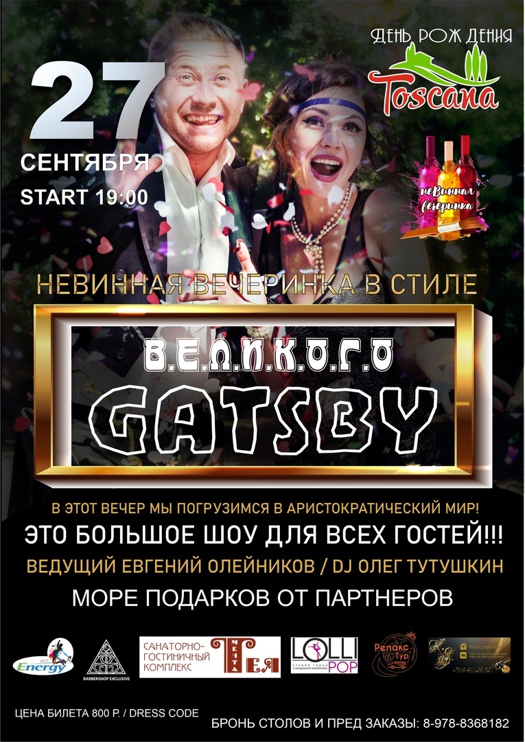 НеВинная Вечеринка приглашает 27-го сентября на грандиозную тусовку в одном из лучшх ресторанов Керчи - Тоскана! Вас ждут изысканные напитки и аппетитные закуски, море конкурсов и подарков от наших щедрых партнёров, головокружительные танцы под музыку от зажигательного диджея и, конечно же, гвоздь программы - картина!
