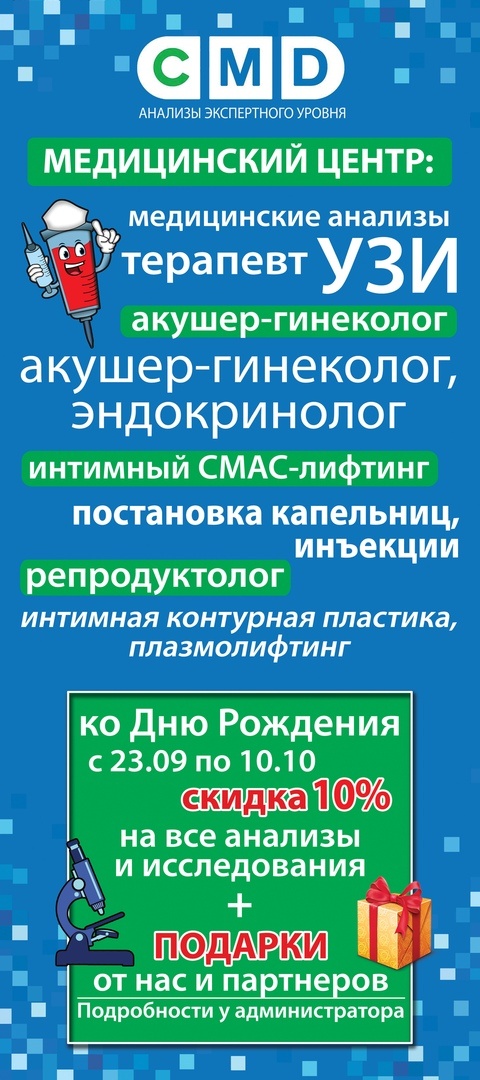 Медицинский центр на базе лаборатории CMD по адресу Карла Маркса 16-б отмечает свой День Рождения 7го октября! Мы хотим разделить этот день вместе с вами, поделиться праздничным настроением, поэтому приглашаем вас записаться на любую процедуру, получить любую услугу или сдать необходимые анализы и присоединиться к празднику с угощениями и многочисленными приятностями!