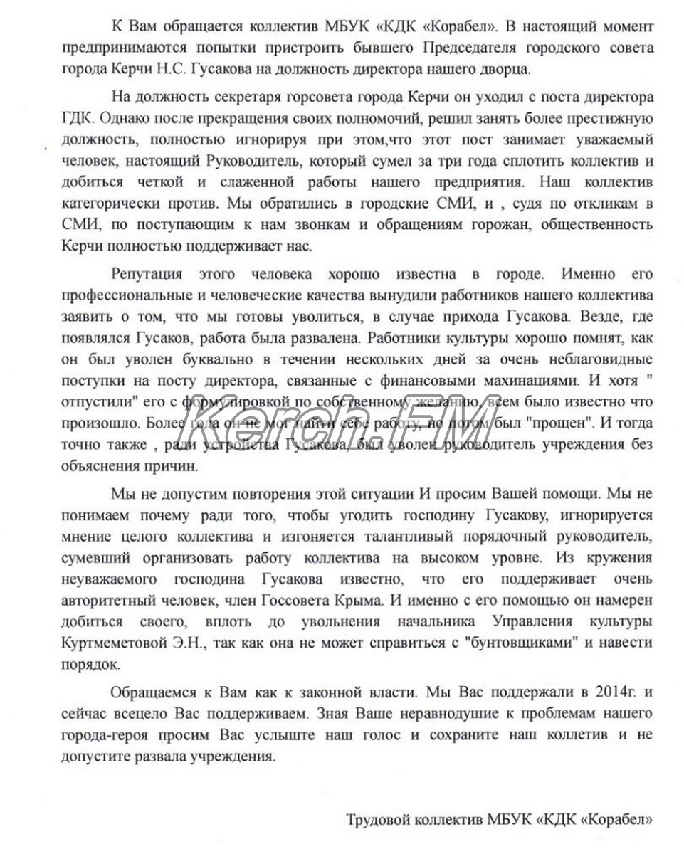 Обращение, которое трудовой коллектив Дворца культуры «Корабел» направил в Госсовет Республики Крым и Совет Министров Республики Крым, предоставили редакции Керчь.ФМ.
