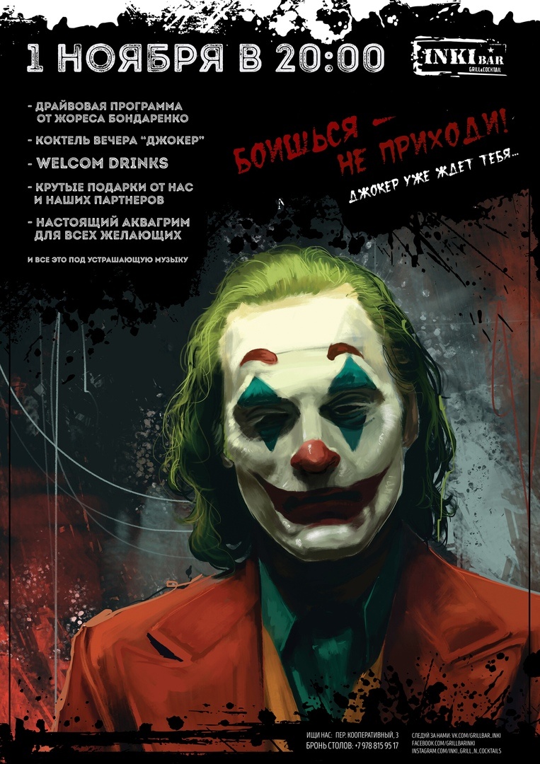 Успей подготовиться и забронировать свой стол по тел. +7 978 815 95 17, потому что в этом году мы устроим тебе настоящий взрыв эмоций и страха, Джокер уже ждет тебя...