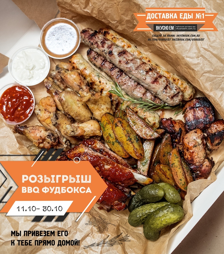 Мы разыграем для тебя наш фирменный, сочный, огромный BBQ фудбокс, а еще привезем его к тебе прямо домой для твоего максимального удовольствия