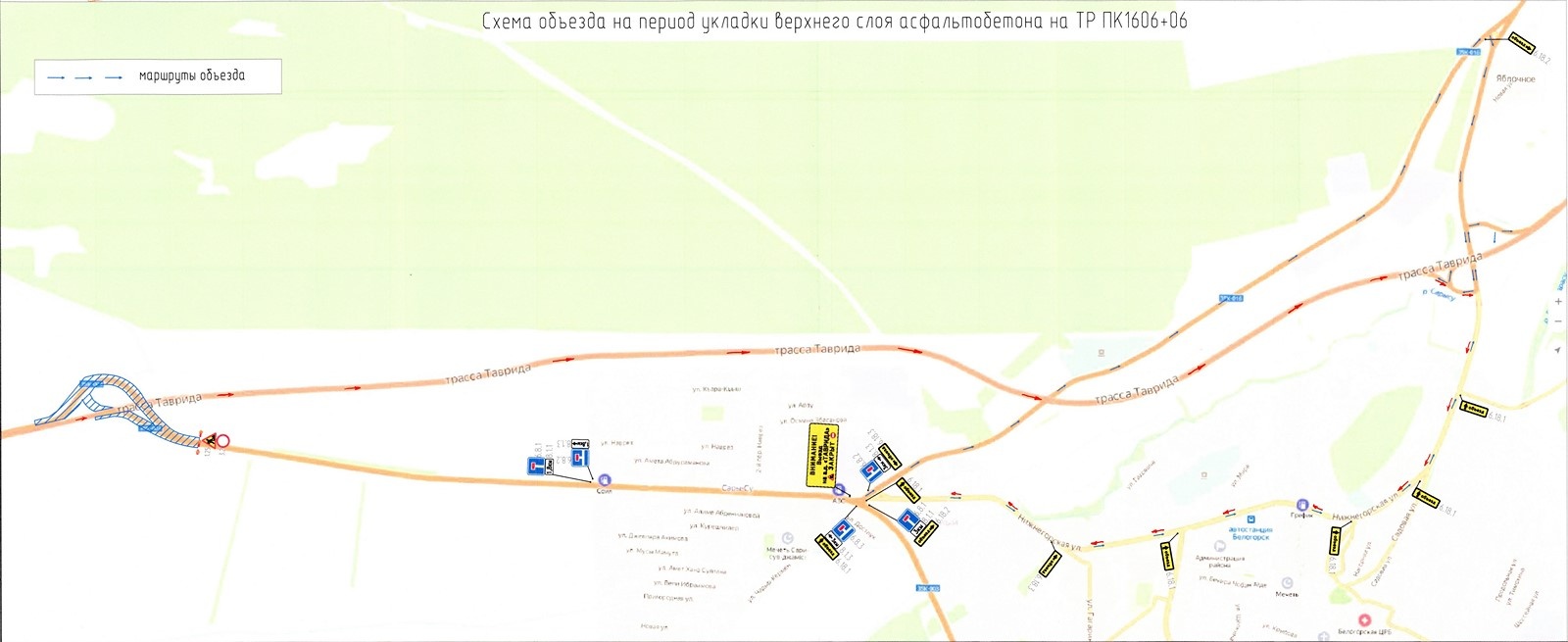 Для въезда в Белогорск и выезда из него водители должны будут двигаться на трассу «Таврида» через Яблочную транспортную развязку в районе села Яблочное. Для движения в сторону Керчи водители также могут воспользоваться старой дорогой, доехав до поселка Приморский, и выехать на трассу «Таврида» через Приморскую развязку.