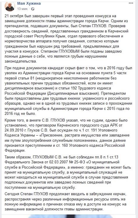 Сегодня Степан ГЛУХОВ продолжает вводить в заблуждение керчан, распространяя через различные информационные ресурсы опять же ложную информацию о причинах отказа ему в доступе на конкурс на замещение вакантной должности главы администрации».